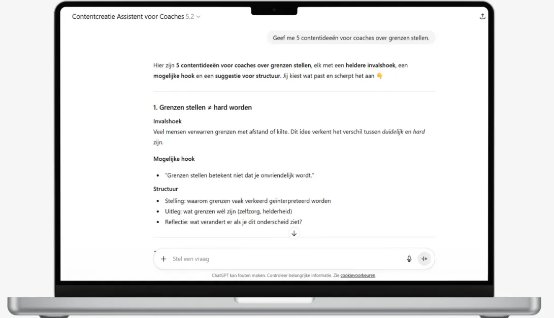 Geen “kant-en-klare copy om te plakken”, wel formats, outline en suggesties die jij verfijnt.
